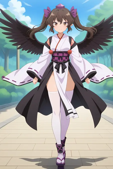 himekaidou hatate, 1girl, solo, brown eyes, brown hair, long hair, twintails, small breasts, bird wings, black wings,, himekaidou hatate \(white crow of commemorative photos\), official alternate costume, kourindou tengu costume, purple hat, tokin hat, hair ribbon, purple ribbon, white kimono, wide sleeves, ribbon-trimmed sleeves, ribbon trim, sash, black bow, pouch, white thighhighs, tengu-geta, pink shoes,