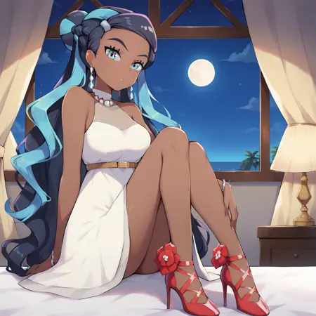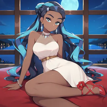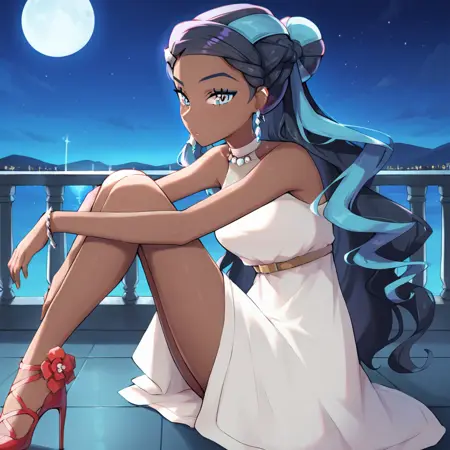 | Trained Words | galnessa, blue eyes, dark-skinned female, two-tone hair, black hair, blue hair, long hair, hair bun, white dress, sleeveless dress, bare shoulders, necklace, jewelry, earrings, hear clip, bracelet, belt, knees, bare legs, high heels, shoes, red footwearCopied! |