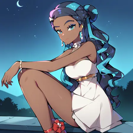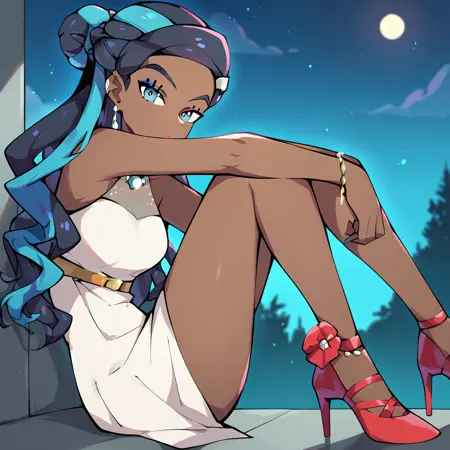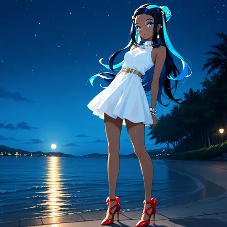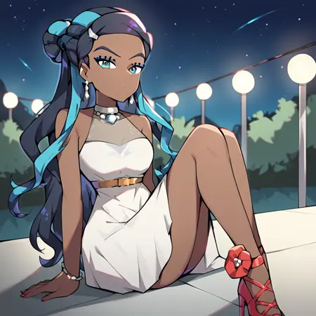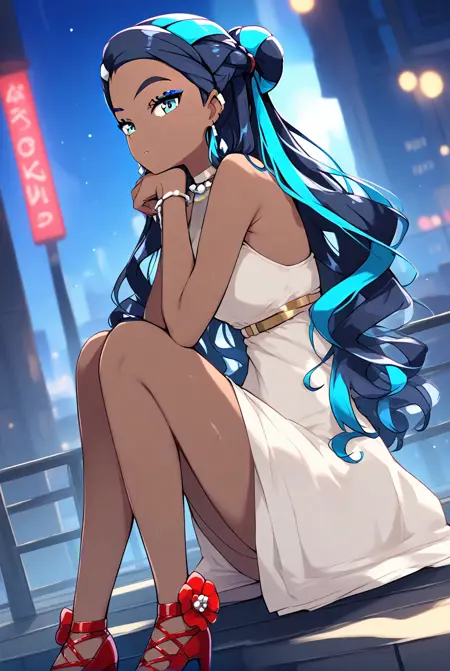 | 训练词汇 | galnessa, blue eyes, dark-skinned female, two-tone hair, black hair, blue hair, long hair, hair bun, white dress, sleeveless dress, bare shoulders, necklace, jewelry, earrings, hear clip, bracelet, belt, knees, bare legs, high heels, shoes, red footwear已复制! |