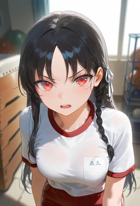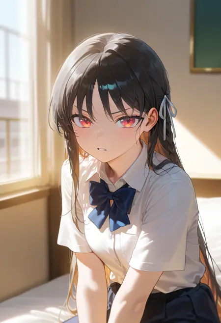 彼女の外見タグ: 1girl, solo, long hair, black hair, red eyes, braid, medium breasts,