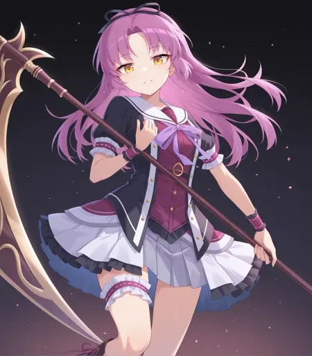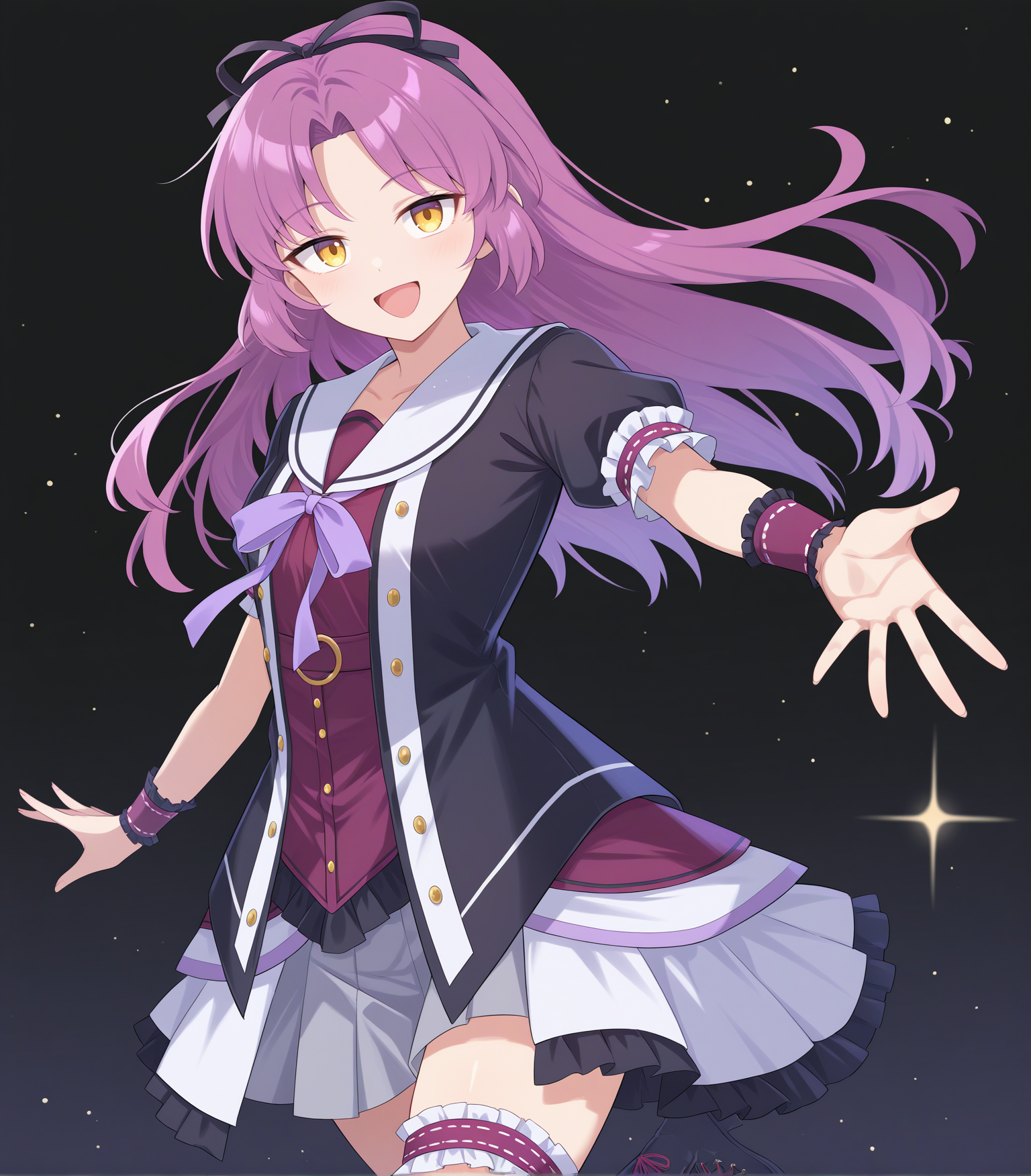 <lora:RenneCS4_Illustrious:1>, Renne Bright, yellow eyes, purple hair, long hair, parted bangs, small breasts, hair ribbon, black jacket, purple shirt, short sleeves, white skirt, thigh band, cross-laced boots,