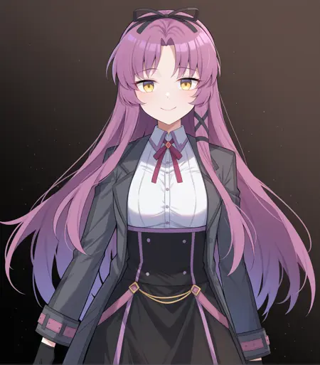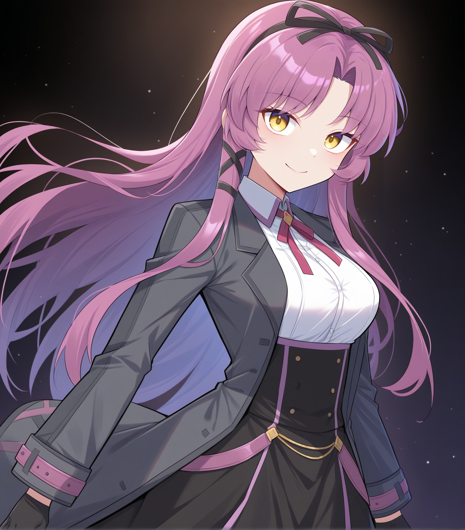 <lora:RenneCS4_Illustrious:1>, Renne Bright, yellow eyes, purple hair, long hair, parted bangs, small breasts, hair ribbon, black jacket, purple shirt, short sleeves, white skirt, thigh band, cross-laced boots,