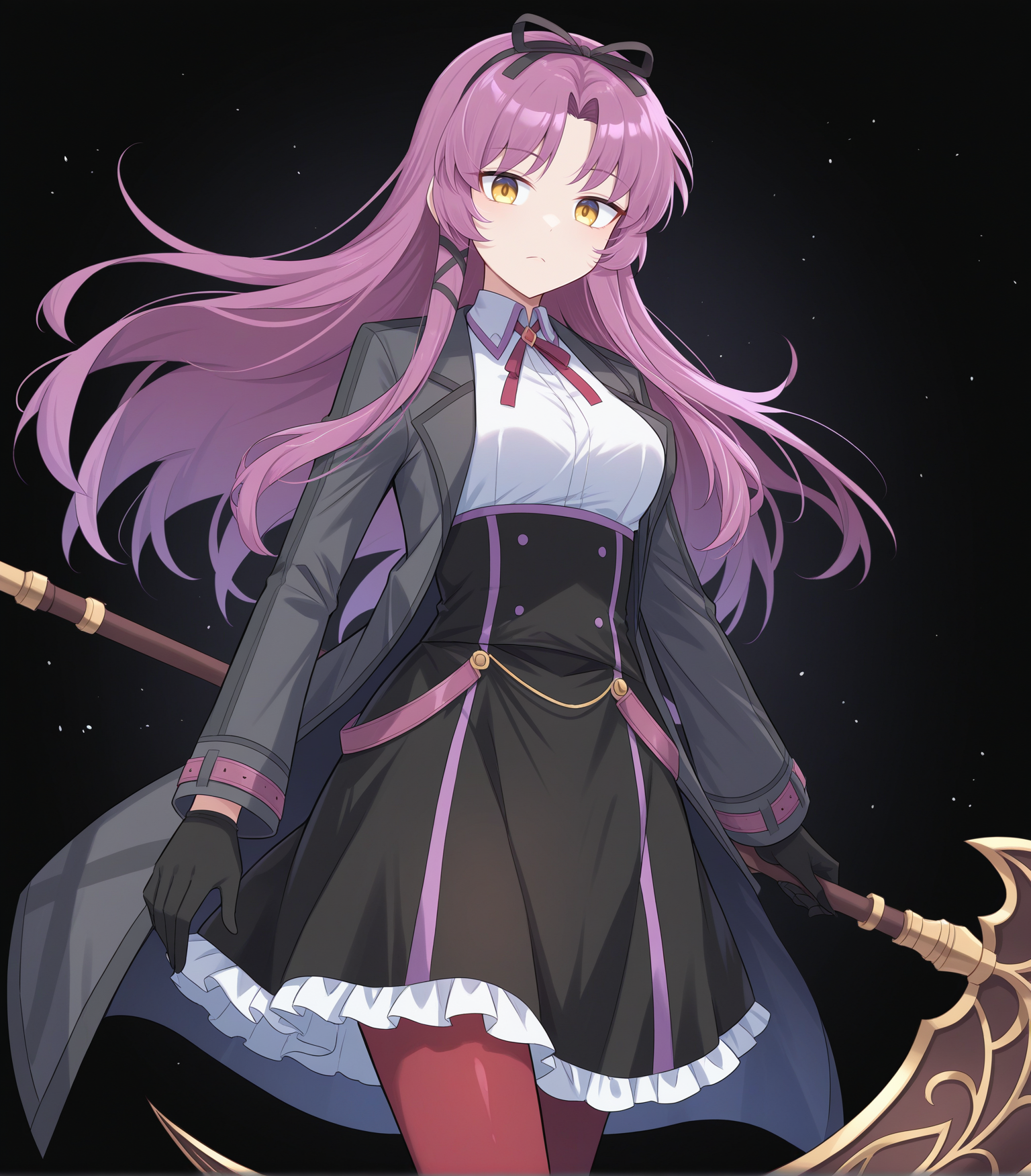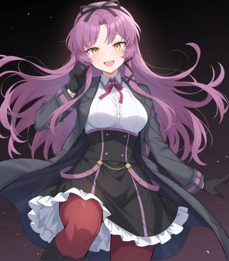 <lora:RenneKuro2_Illustrious:1>, Renne Bright, yellow eyes, purple hair, long hair, parted bangs, medium breasts, hair ribbon, black coat, white shirt, red pantyhose, black knee boots, short black skirt, frills, black gloves,