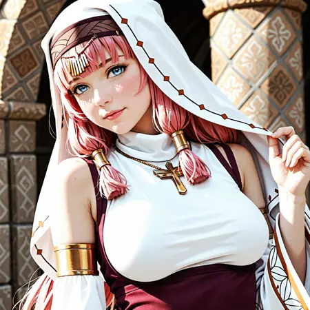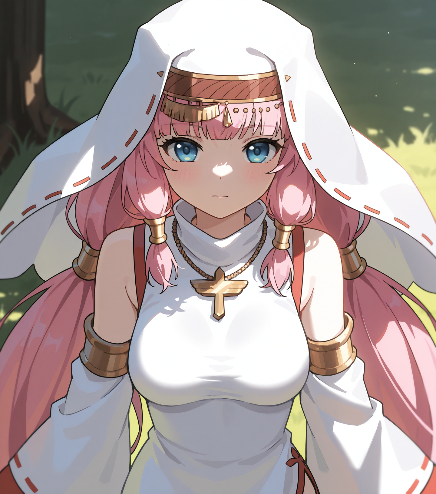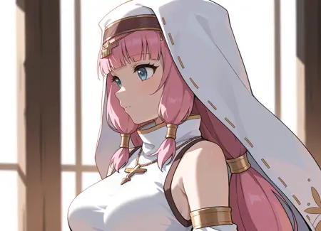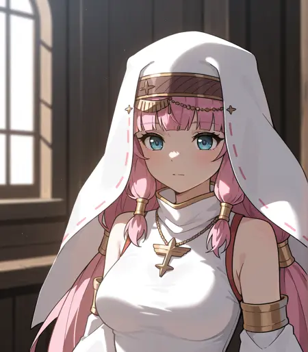 1girl,breasts,solo, long hair,very long hair,low twintails,pink hair,bangs,hair tubes,blue eyes,