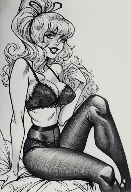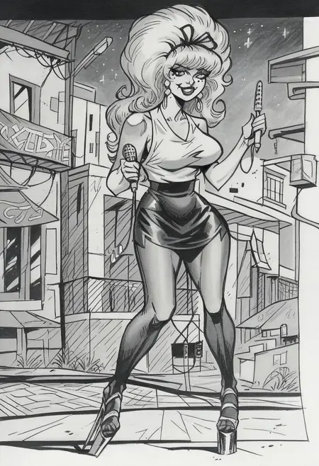 标签为:“N4nny_D,大胸,乳沟,长发,发带”,并根据偏好选择“马尾”或“蜂巢发型”。“金发”仅在彩色版本中使用。你也可以尝试添加“眼睛下方的痣”和/或“手持麦克风”,但结果可能与此不一致。她没有固定着装,但作为基础,通常穿着“迷你裙、丝袜、厚底高跟鞋”。“单色、灰度、传统媒介”则更适合还原原始艺术风格。