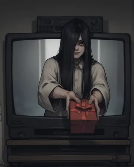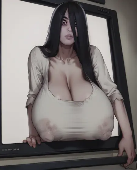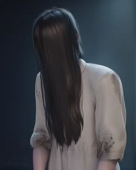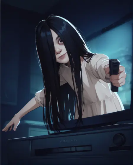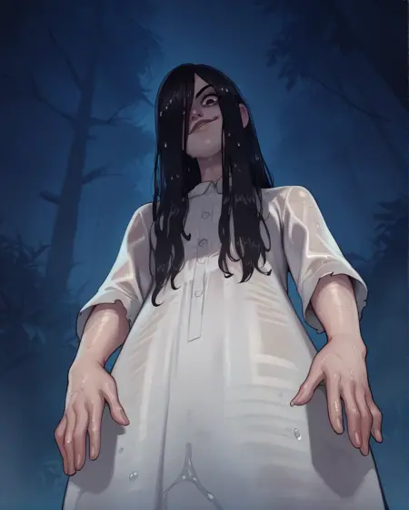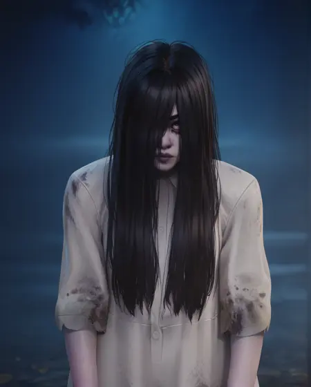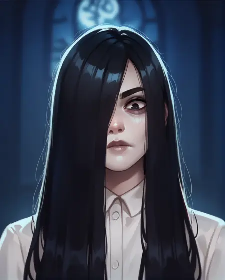 Sadako, long black hair, black eyes, or white eyes, bags under eyes,