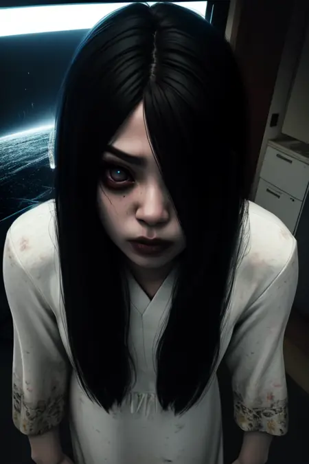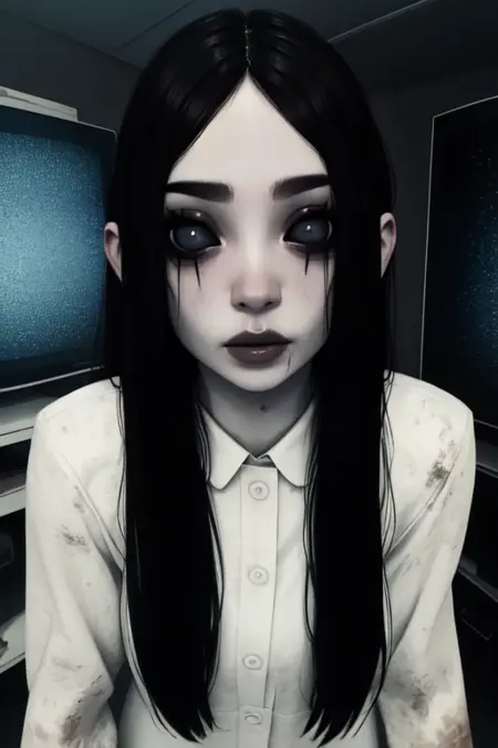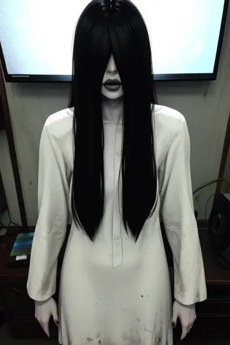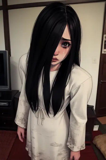 Sadako, long black hair, black eyes, or white eyes, bags under eyes,
