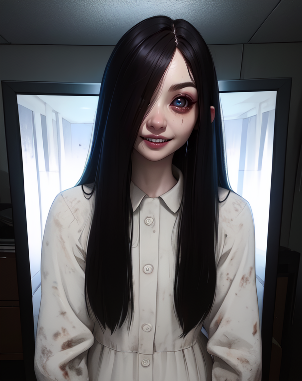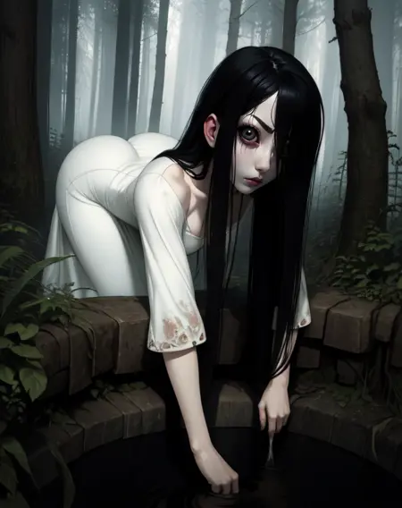 Sadako、長い黒髪、黒い目または白い目、目の下のクマ