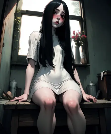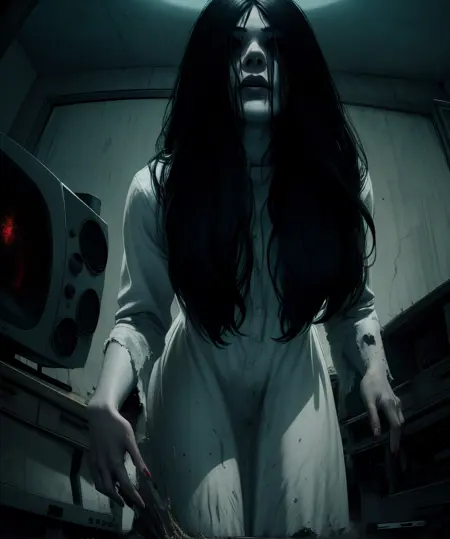 사다코, 긴 검은 머리, 검은 눈 또는 흰 눈, 눈 아래 다크서클,