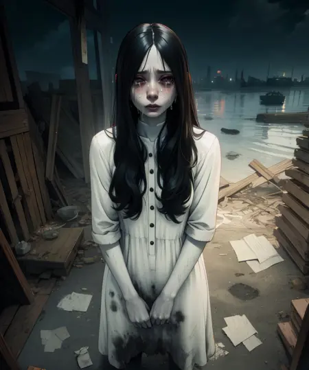 ** Sadako**,黑色长发,黑色眼睛或白色眼睛,眼周有黑眼圈