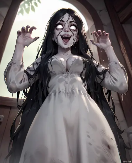 Sadako, long black hair, black eyes, or white eyes, bags under eyes,