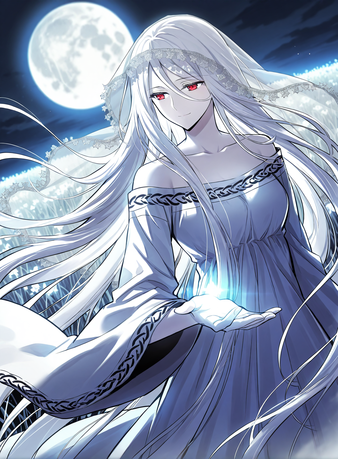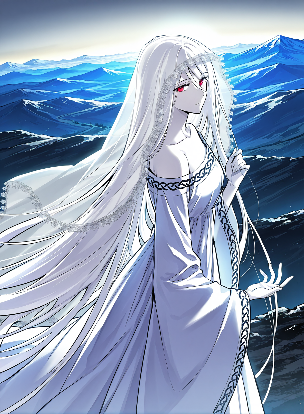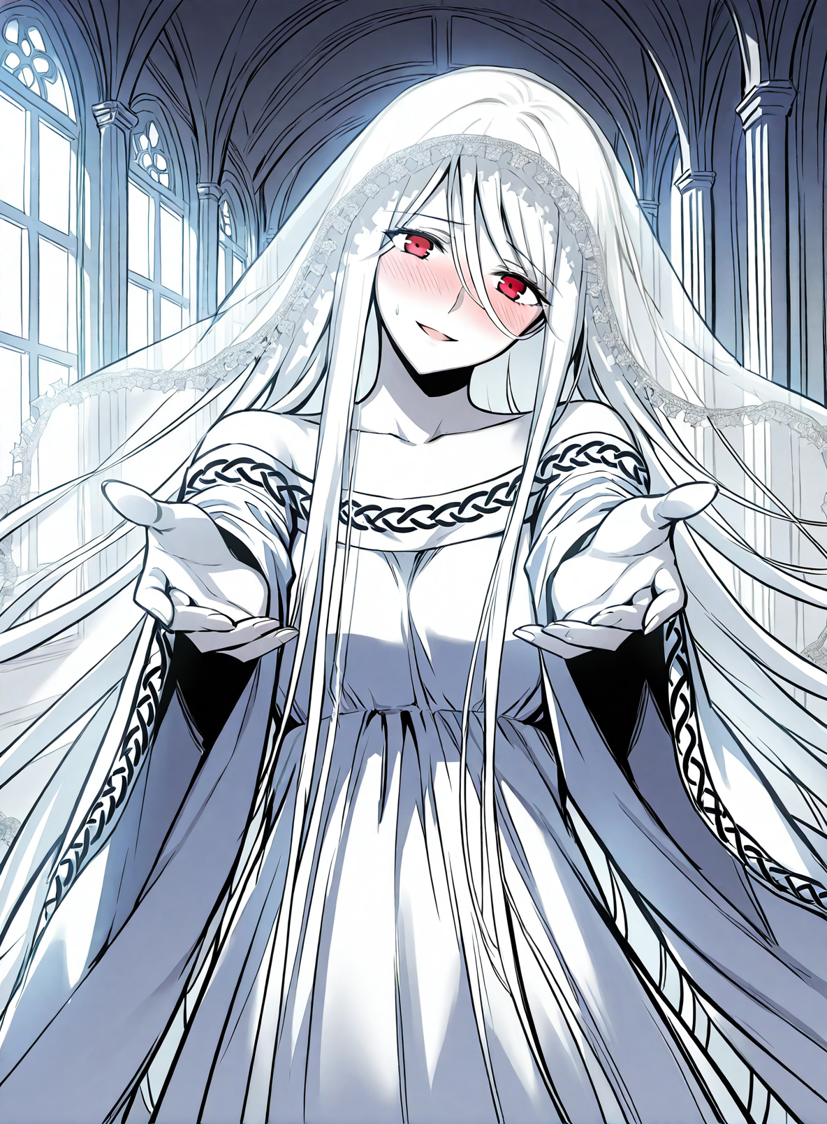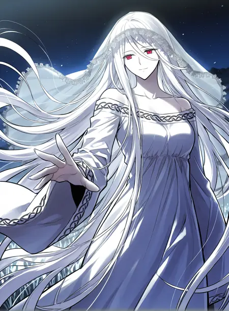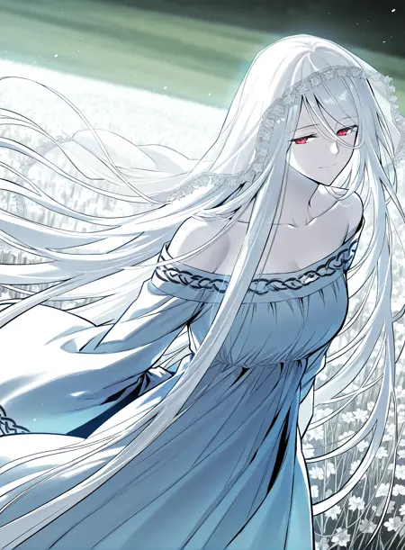 white dress, veil, collarbone, wide sleeves, long sleeves, bare shoulders