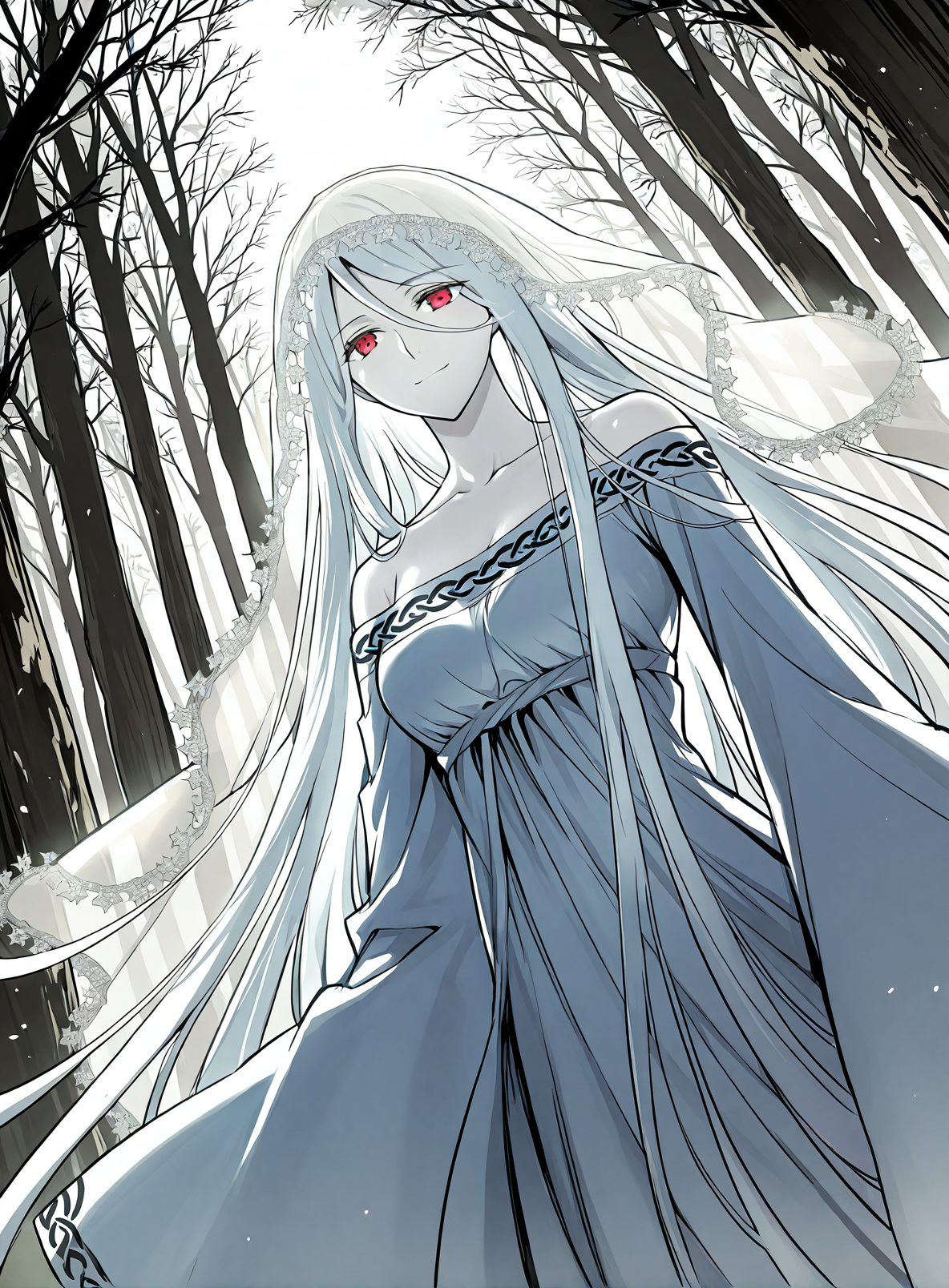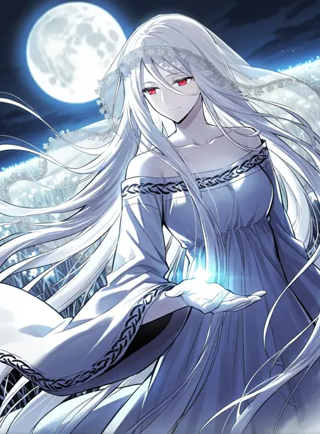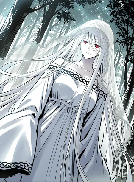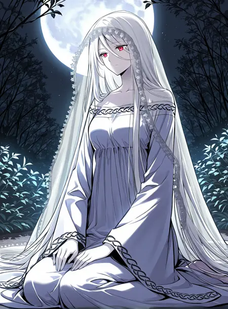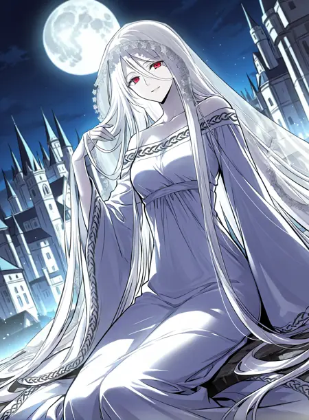 1 girl, red eyes, pale skin, hair between eyes, white hair, very long hair, bangs