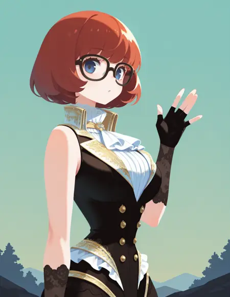 Based on a high collared baroque/victorian corset-vest with a plunging neckline and psuedo peplum waist. Works well with garrison cap, mini hat, top hat. The training has no real bottom information so pants, ballgown, jodhpurs, pleated skirt, etc all should work fine