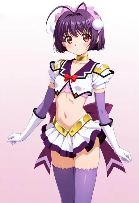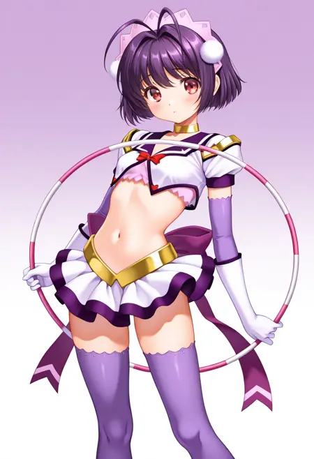 Clothes : headdress,choker,crop top,purple elbow gloves,white gloves,skirt,back bow,purple thighhighs,white ankle boots,