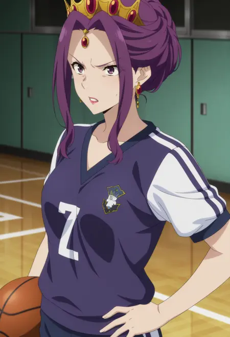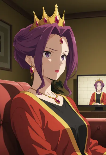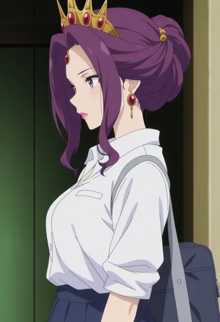 1girl, solo, m1rellia, purple hair, purple eyes, jewelry, earrings, lipstick, crown, makeup, {attire tags}, {actions and/or poses}, {indoors || outdoors}, {background description}