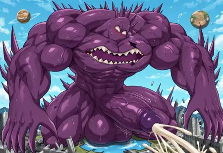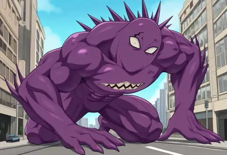 标签:紫色皮肤,尖牙,怪物,爪子,肌肉发达,大眼睛(可选),黑眼睛,全身(可选),巨型(可选),尖刺(通常无论如何都会出现),宏观(可选)