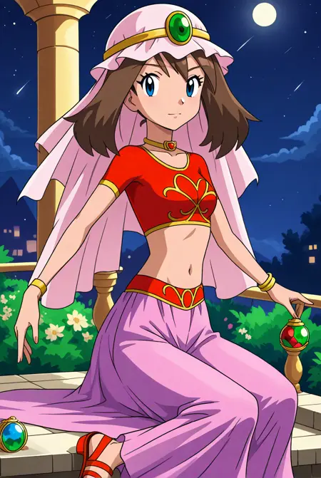 wmay, [may_\(pokemon\) blue eyes, brown hair, medium hair, arabian clothes, orange shirt, very long skirt, veil, gem, white headwear. choker, short sleeves, jewelry, midriff, sandals, toes, brown footwear