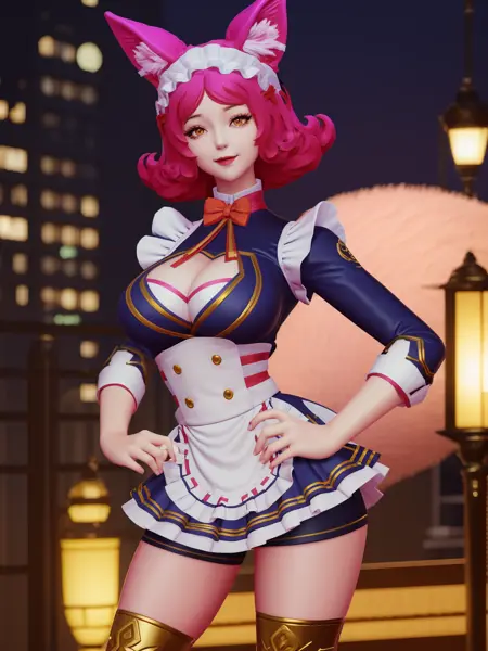 - WZRYdajiNPKF, 1girl, solo, thighhighs, breasts,cleavage, orange eyes, fox tail, fox ears, red hair, looking at viewer, maid headdress, apron, maid, waist apron, dress, over-kneehighs, clothing cutout, standing, shorts, large breasts, short hair, medium breasts, long sleeves, bow, red eyes, pink hair, smile, frills, choker, lips, cityscape, night, mature female,