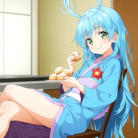 青髪、非常に長い髪、ツノのような髪、乱れた髪、緑の目、鎖骨、和服、青い着物、柄入り着物、赤い花柄、紫と白の帯、重ね帯、前スリット、長い袖、広い袖、紫の背中リボン、紫の縁取り、ロングドレス、