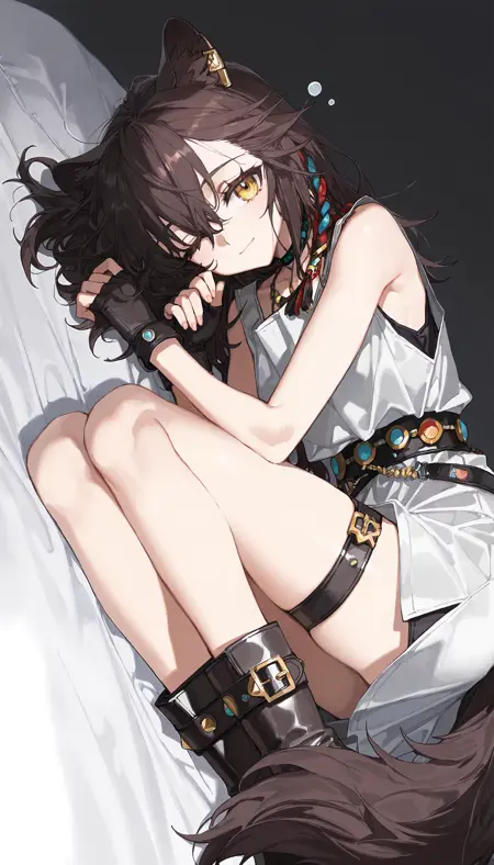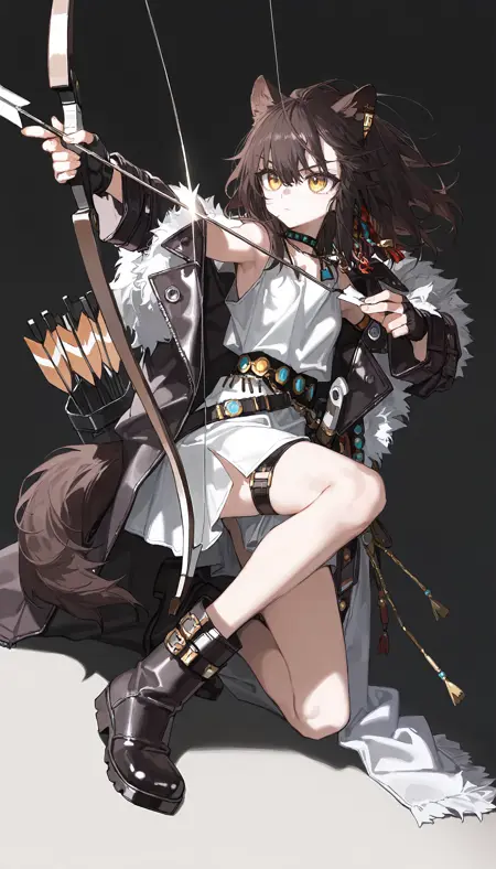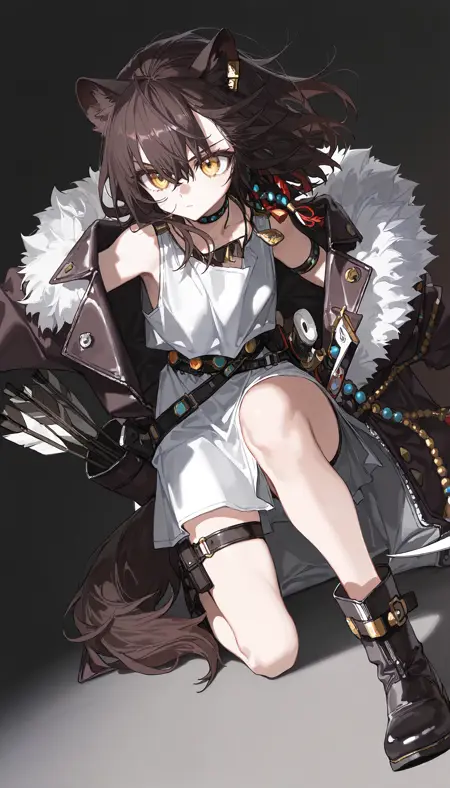 黄色い目、茶色の髪、オオカミの尾、髪リボン、髪輪