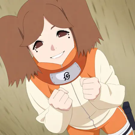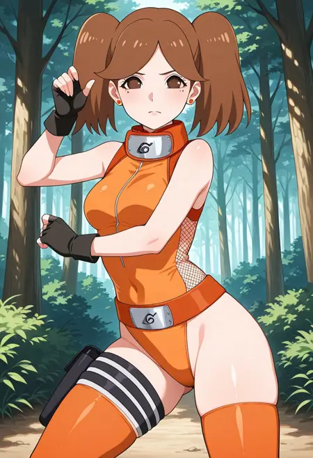 ((颈戴深灰色木叶标志的木叶橙色护额,性感无袖上衣为米色,肩部区域为橙色,短款橙色裙子,枪套,大腿绑带)) 棕色忍者靴,
