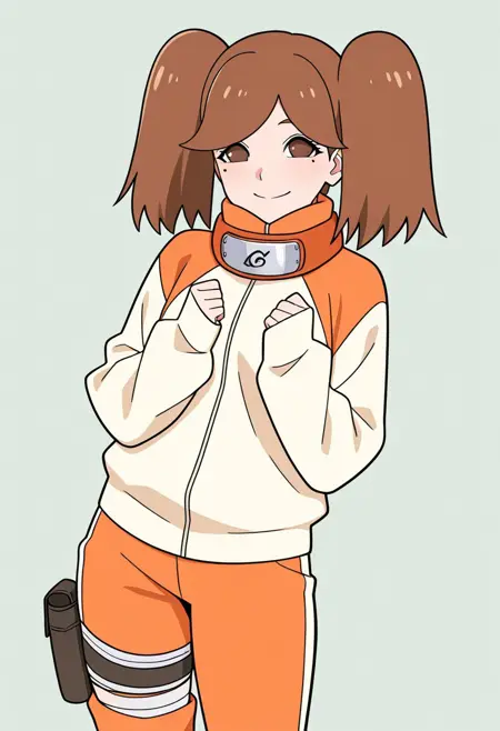 ((颈戴深灰色木叶标志的木叶橙色护额,高领橙色毛衣覆盖颈部,长袖直达指尖,毛衣主体为米色,肩部、袖口和领口为橙色,短款橙色裤子,枪套,大腿绑带)) 棕色忍者靴,