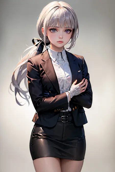 Danganronpa 3: kirigiridr3, ponytail, hair ribbon, jacket, open jacket, long sleeves, white shirt, skirt, black gloves