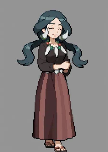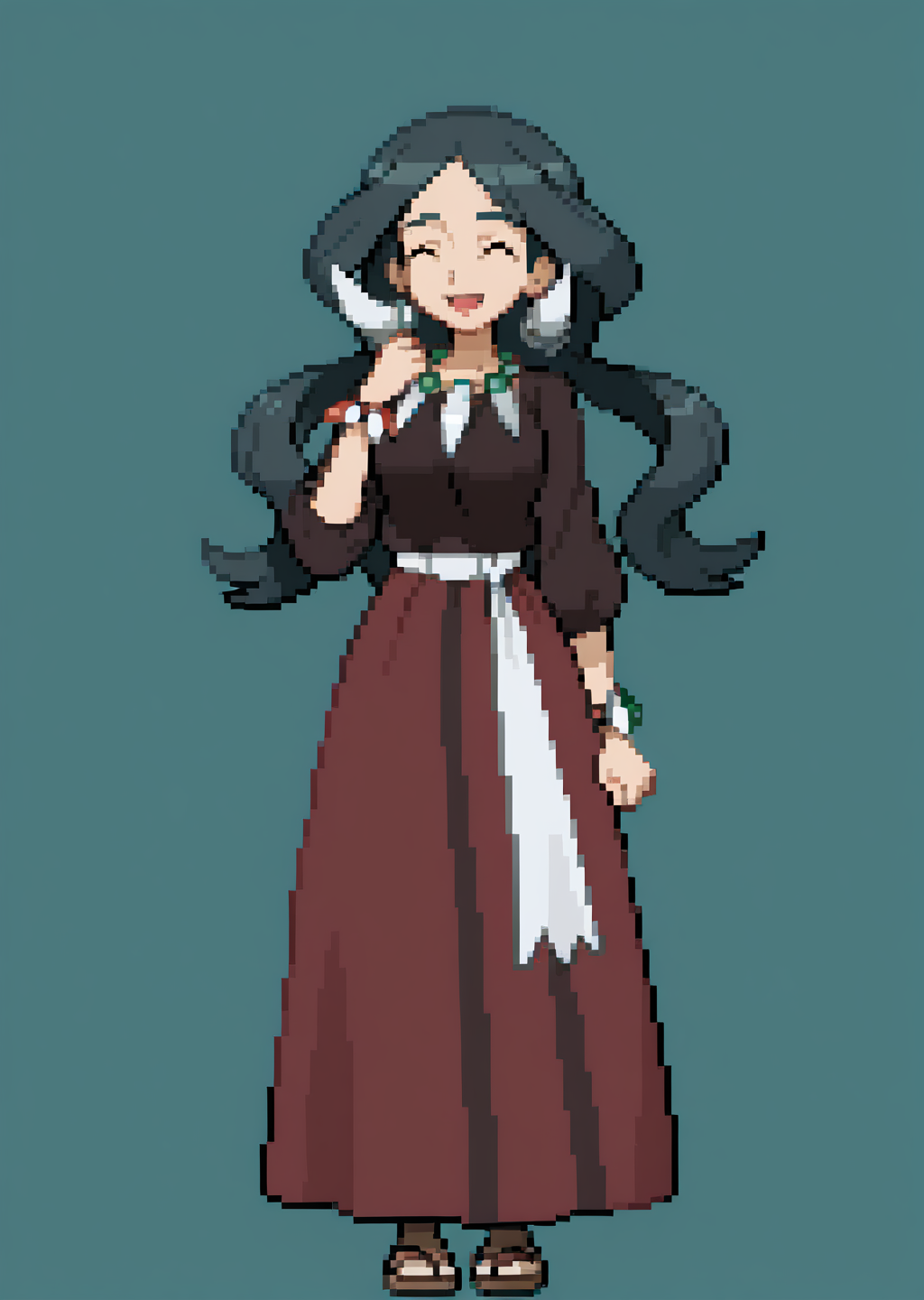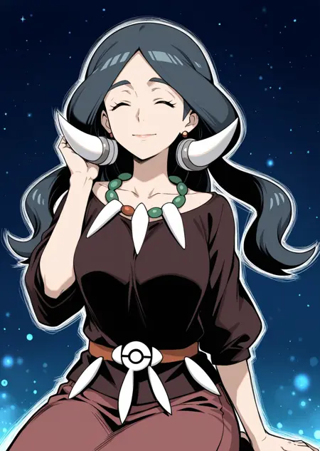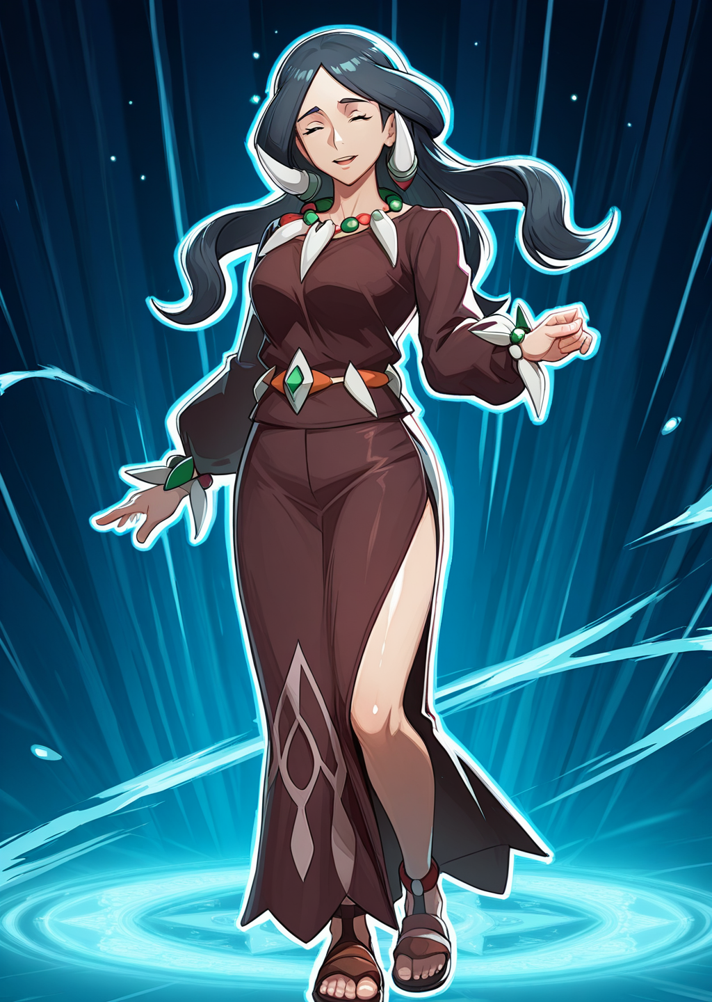 프롬프트: 긴 머리, 검은 머리, 목걸이, 드라스나(포켓몬), 드라스나, 눈 감음, 헤어피스, 눈 감음, 성숙한 여자,