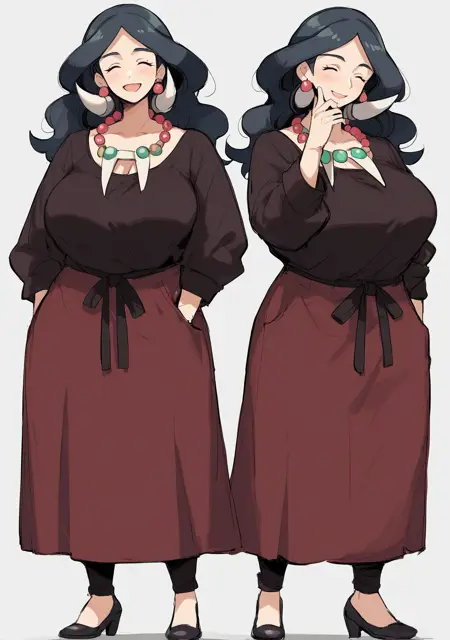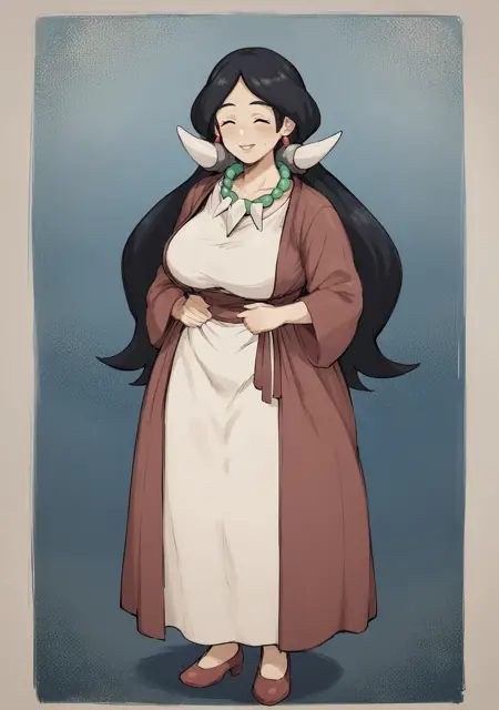 프롬프트: 긴 머리, 검은 머리, 목걸이, 드라스나(포켓몬), 드라스나, 눈 감음, 헤어피스, 눈 감음, 성숙한 여자,