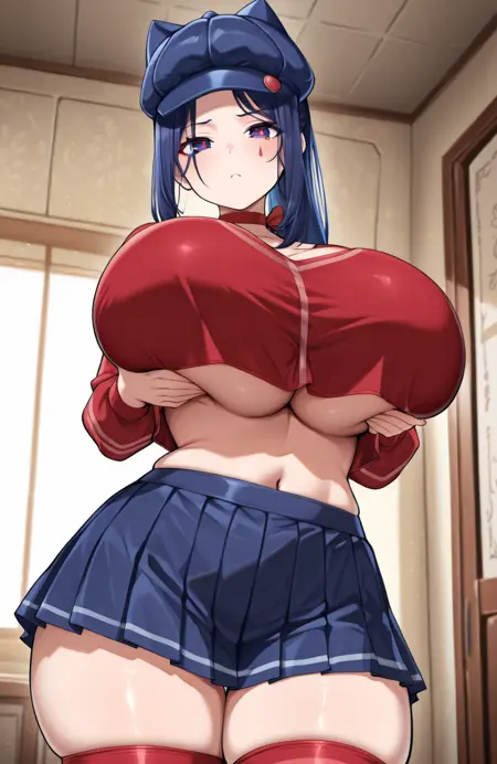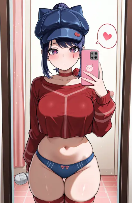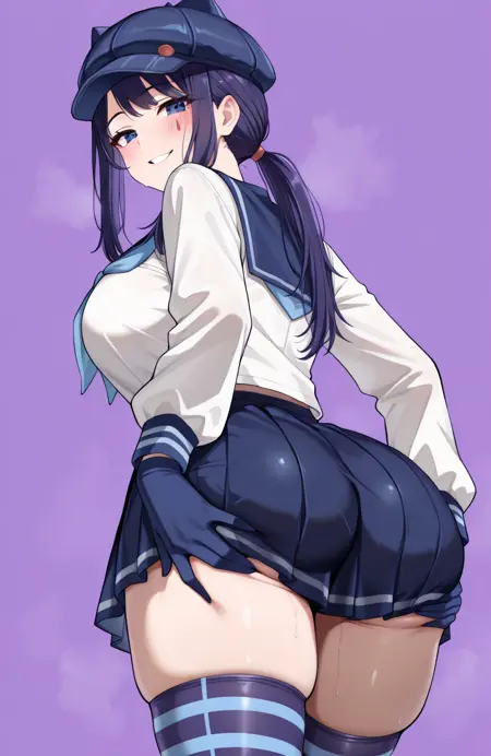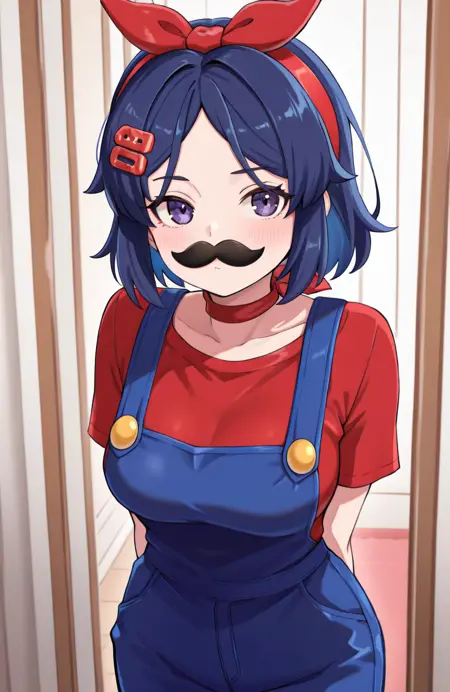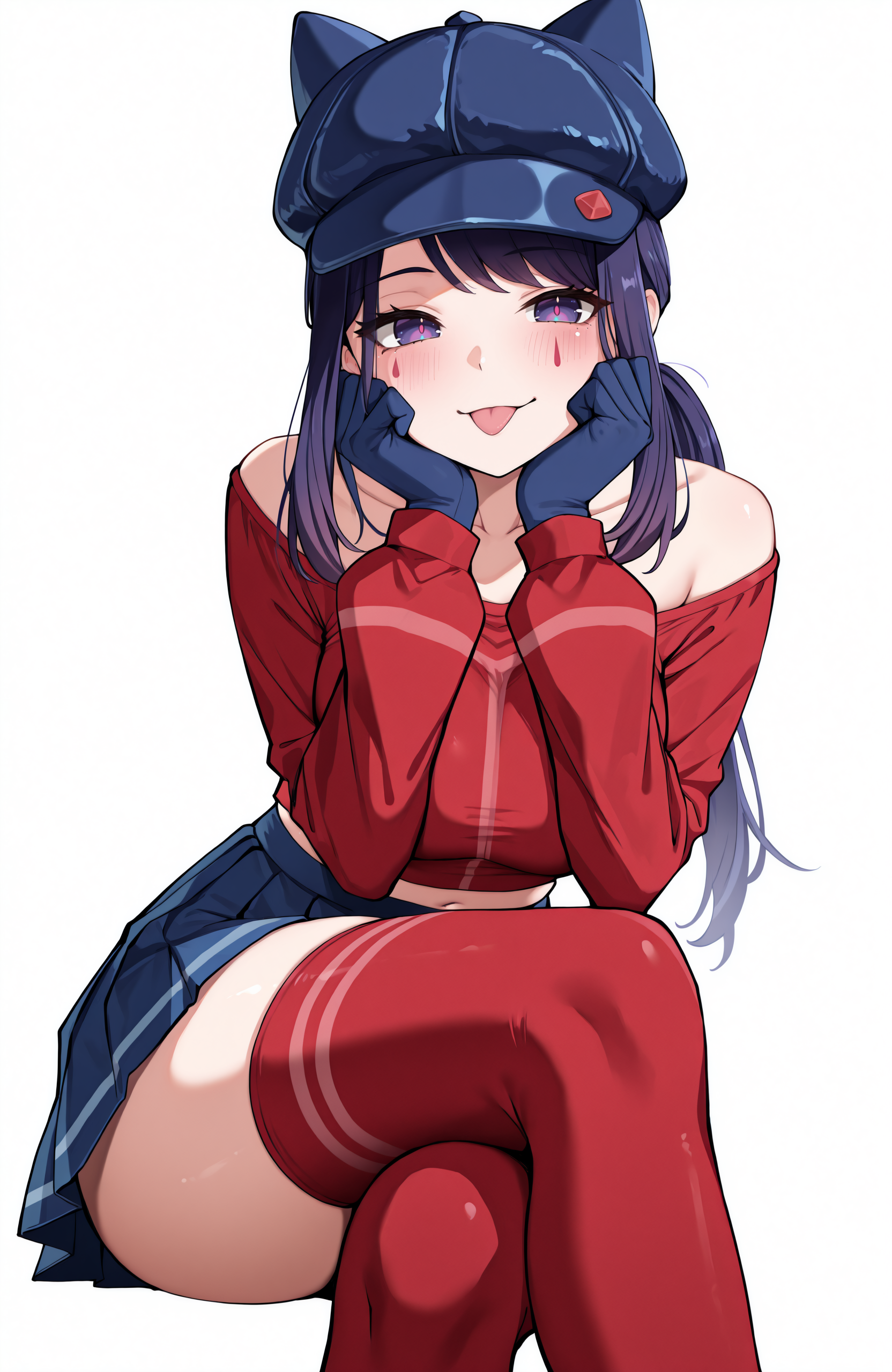 酷酷的Mita:CoolM,泪滴状面部标记,蓝色出租车帽,蓝色手套,低扎马尾,(猫帽?但出租车帽应该可行)