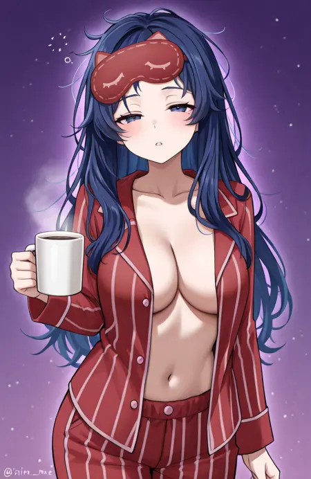 SlpM,头发散落,红色睡衣,头戴睡眠眼罩,蓝色丝带项圈,紫色眼睛,长/中长发,条纹衣物,蓝色头发,长袖,锁骨,凌乱头发,条纹上衣,困倦,短裤,单脚踝丝带(可选卷发)