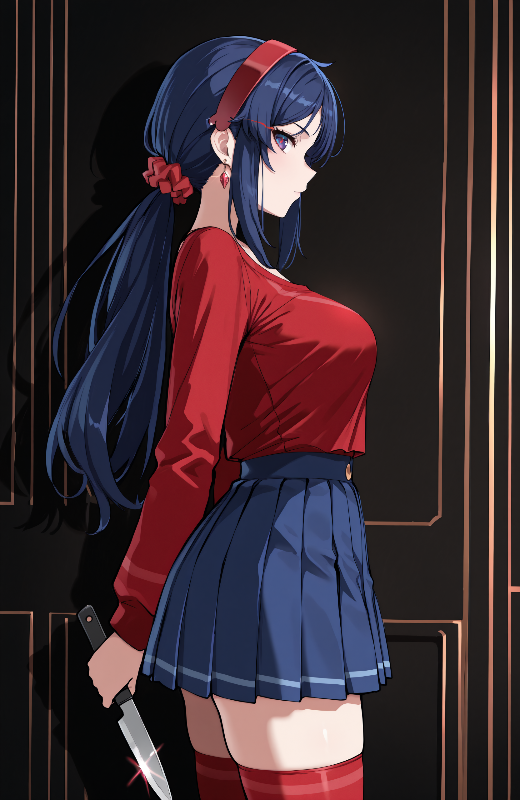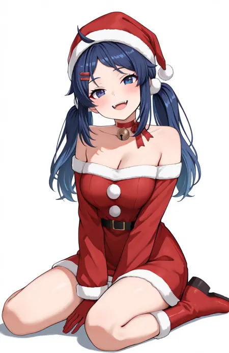 整体:紫色眼睛,蓝色头发,双马尾,红色短上衣,蓝色裙子,百褶裙,条纹长筒袜,红色长筒袜,露肩上衣,红色丝带项圈(不确定“条纹长筒袜”是否有用)