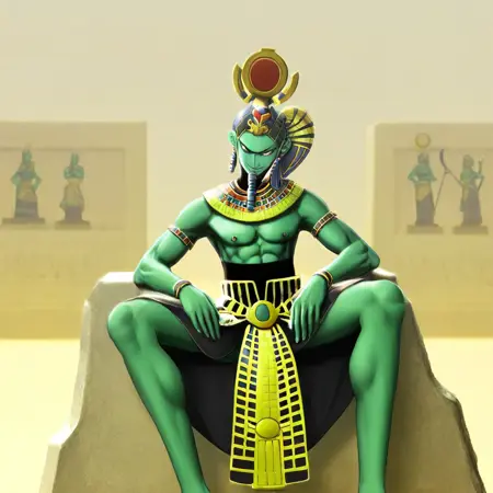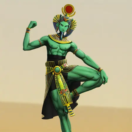 Khonsu, colored skin, green skin, headdress, muscular, jewelry, armlet, Egyptian clothes, skirt,