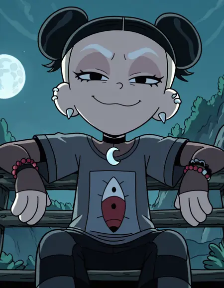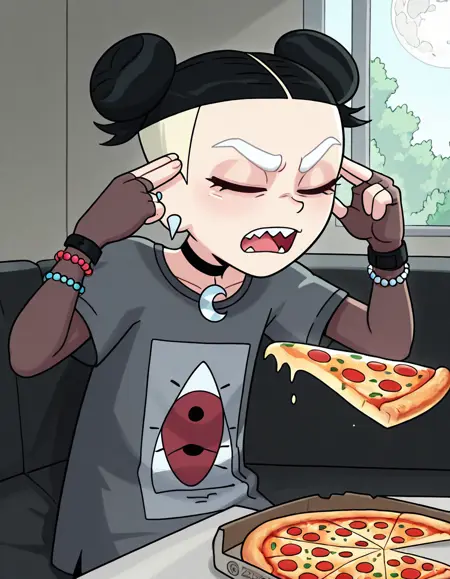 tabithacotc, 흰색 눈썹, 검은 머리, 머리 뾰족, 더블 뾰족, 귀걸이, 검은 눈, 검은 목걸이, 귀 piercing, 달 목걸이, 회색 셔츠, 프린트 셔츠, 짧은 소매 위에 긴 소매, 피쉬넷 팔찌, 손가락 없는 장갑, 검은 바지, 부츠, 비즈 팔찌,
