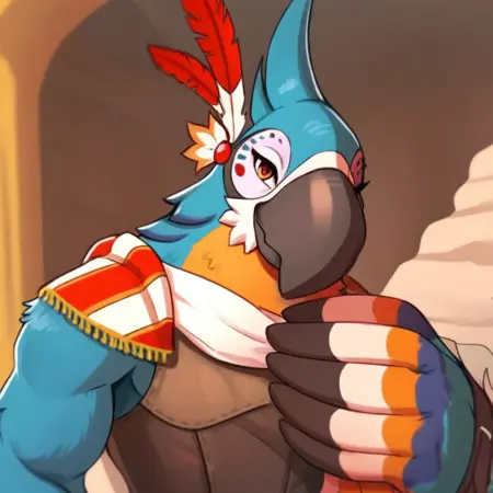 Anthro,bird boy,kass,feathers,blue fur,light underbelly,mulicolored body,yellow fur,brown eyes,beak,half body,clothes,muscular male,buff