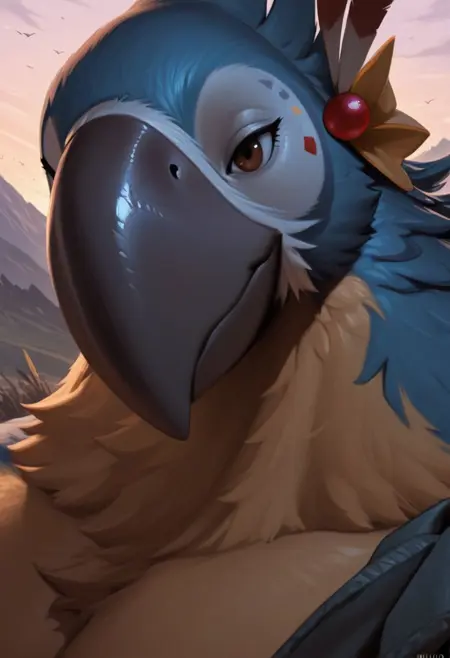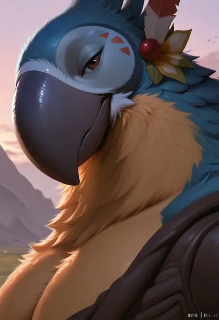 Anthro,bird boy,kass,feathers,blue fur,mulicolored body,yellow fur,brown eyes,beak,muscular male