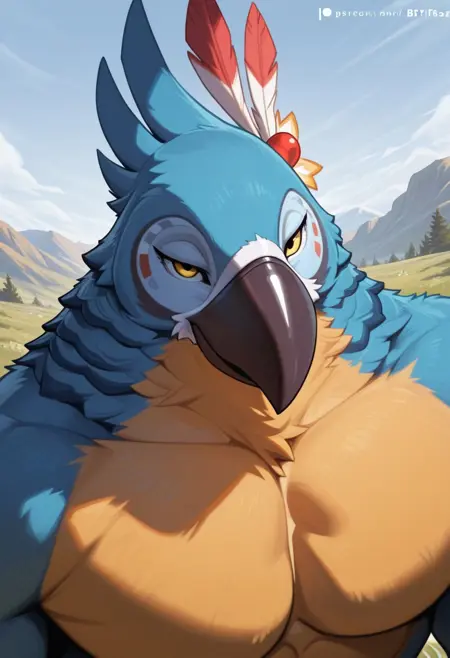 Anthro,b1rd,KaSs,blue fur,muscular male,beak,yellow eyes
