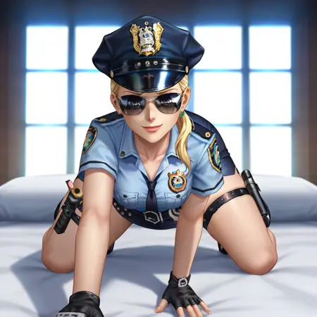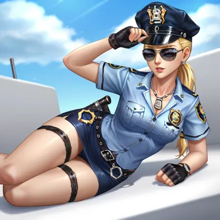| 训练词汇 | CSO_Rebecca, 1girl, solo, blonde hair, police, police uniform, policewoman, sunglasses, hat, uniform, skirt, gloves, belt, fingerless gloves, aviator sunglasses, miniskirt, shirt, pencil skirt, holster, police hat, thigh strap, high heels, blue shirt, police badge, black gloves已复制! |