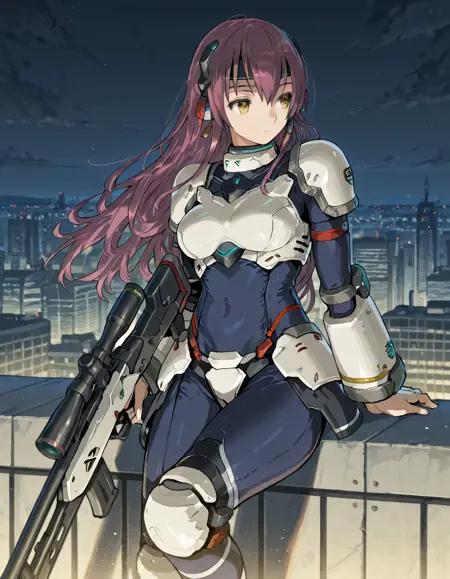 1girl,xiahsecond,purple hair,yellow eyes,long hair,mechanical outfit,android,headgear,headband,navy bodysuit,chest armor,shoudler armor,white knee pads,black kneehighs,white gauntlets,faulds,