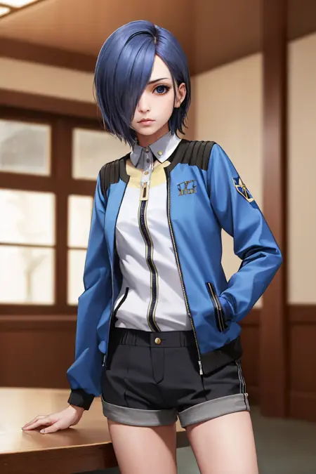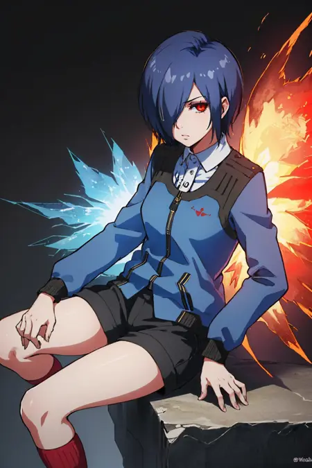 트리거 + 일반 외모: kirishima touka, 파란 머리, 한쪽 눈 위의 머리카락, 파란 눈