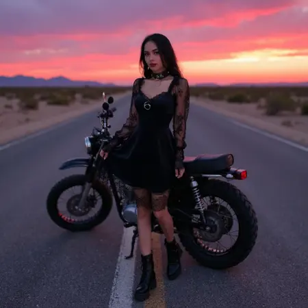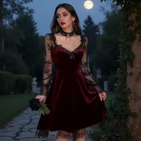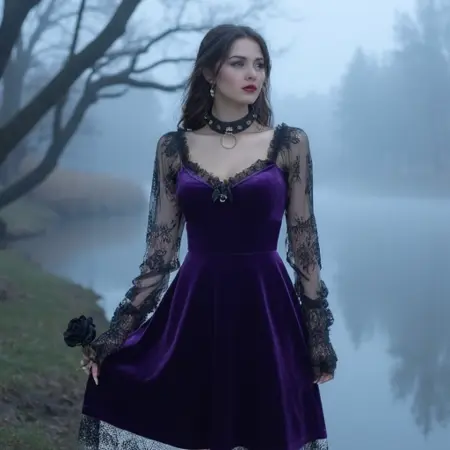 - Accessories: Paired with a gothic choker necklace featuring a circular pendant, enhancing the overall dark and sophisticated aesthetic.