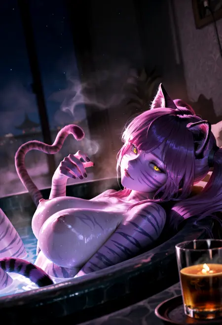 (보라색 피부, 색상이 있는 피부), 얼굴 무늬, 고양이 귀, 노란 눈, 수직 동공, 분홍 머리, 보라 머리, 듀얼 테일, 앞머리, 두꺼운 머리카락, 동물 귀, 거대한 가슴, 고양이 꼬리, 호랑이 무늬, (두꺼운 허벅지:1.2), 넓은 골반,