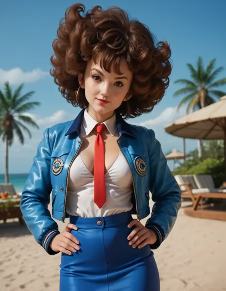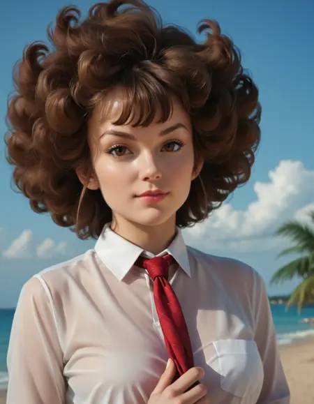 Cynthia, collared shirt, red hair, skirt, blue jacket, brown hair, red necktie, afro, brown eyes