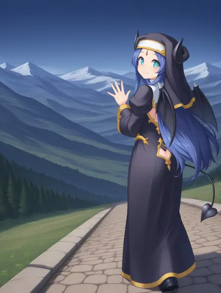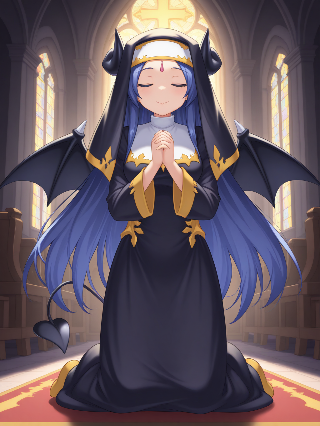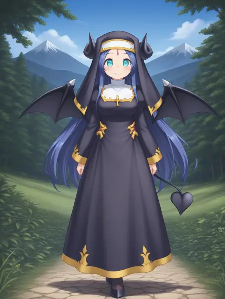 克里斯蒂,蓝发,长发,青色眼睛,角,恶魔尾巴,恶魔翅膀,修女服,修女