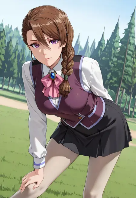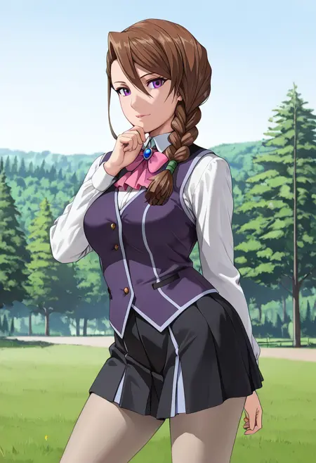(school_uniform, dress, white_shirt, collared_shirt, ascot, bow, bowtie, ribbon, pink_bow, long_sleeves, jewelry, brooch, gem, vest, purple_vest:1.2), beige_pantyhose, fine fabric emphasis,