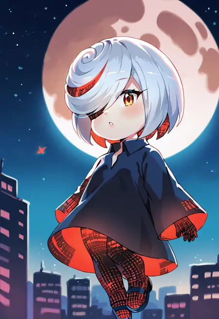 我的基础提示:Sage_(SonicFrontiers), 1girl, 红眼睛, 妹妹, 儿童, 刘海飘逸, 白发, 红色发条, 一只眼睛被遮住, 黑色连衣裙, 长袖, 黑色睡衣, 袖子超过手腕, 翻领
