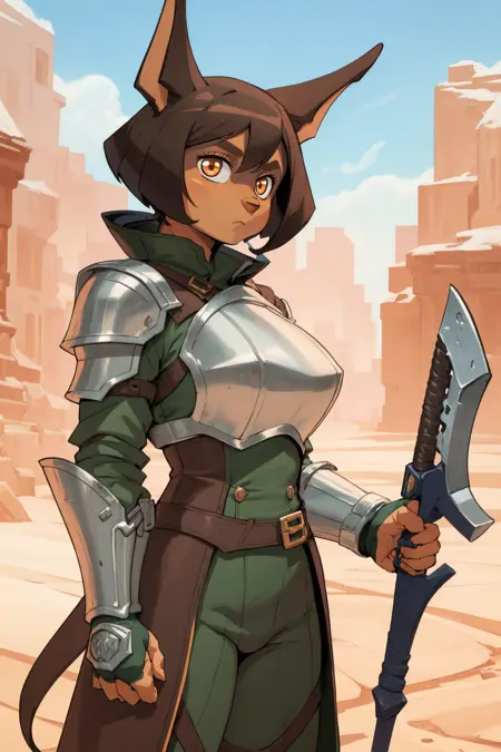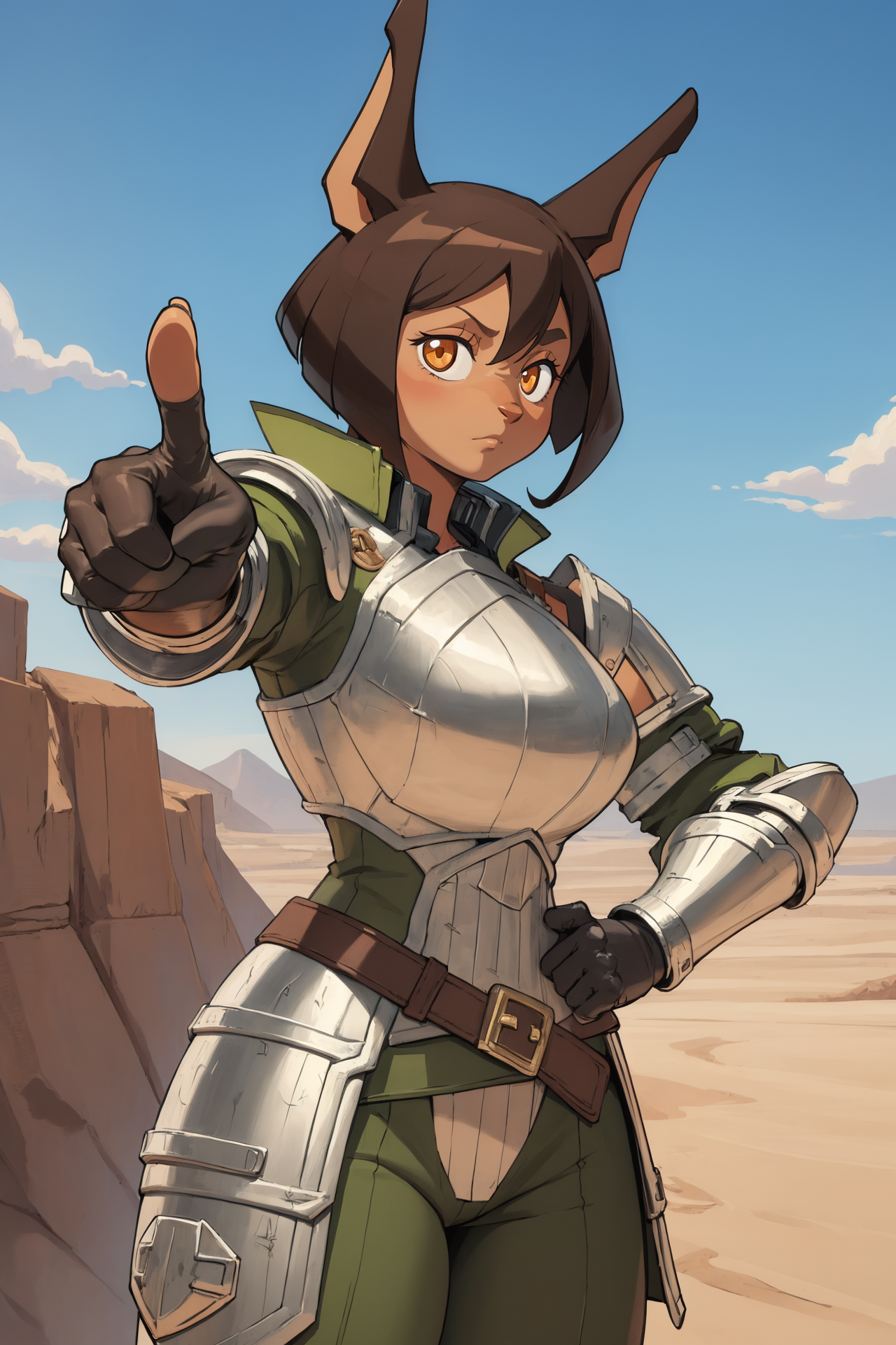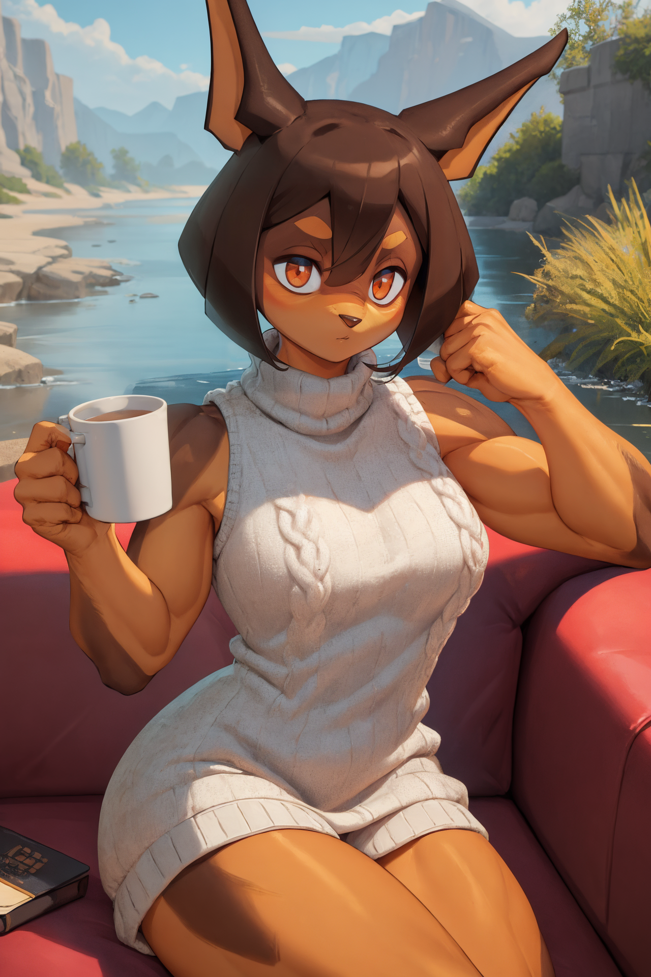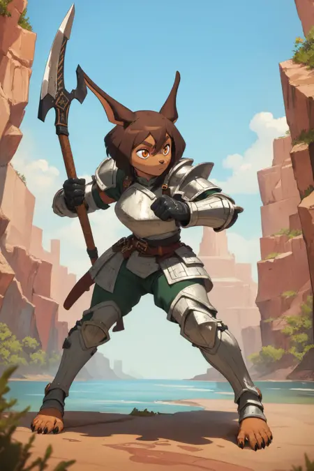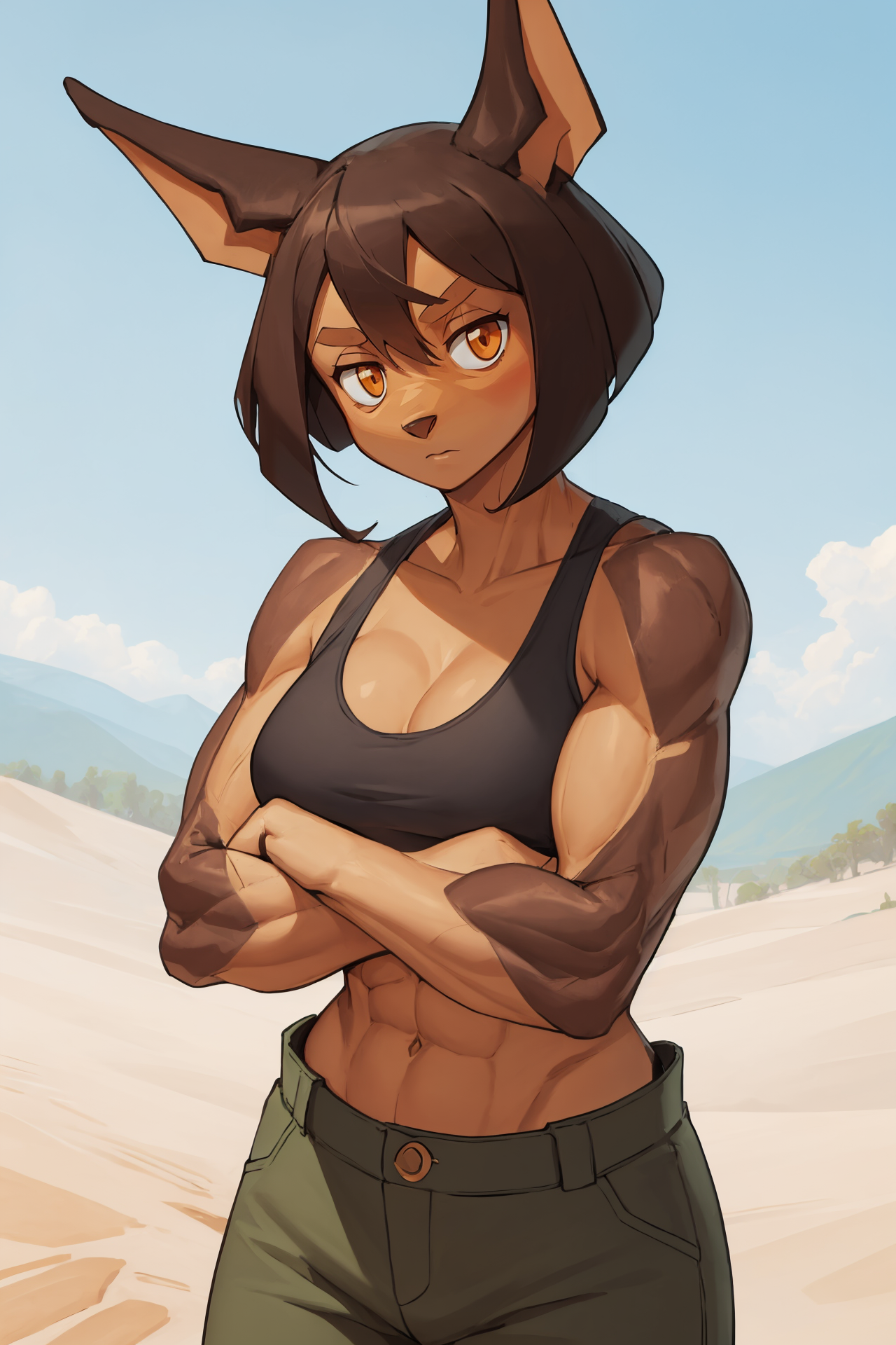 トリガー:**「RoryCeehaz, furry」**は常に必要です。一貫した外見にするには、「オレンジ色の目、筋肉質、無表情」を追加してください。