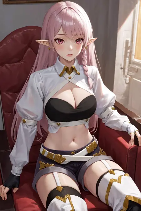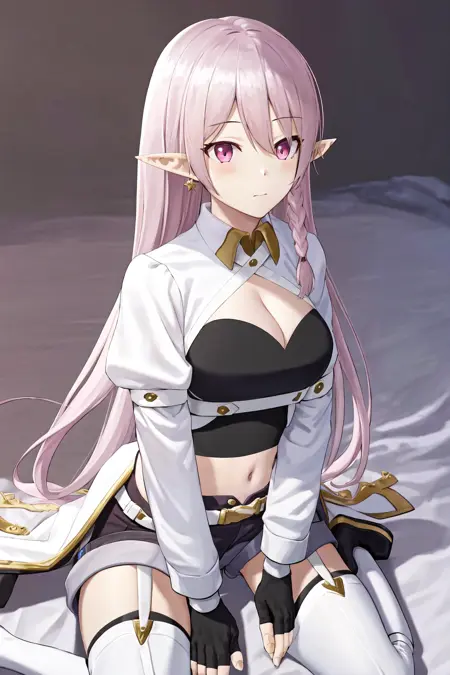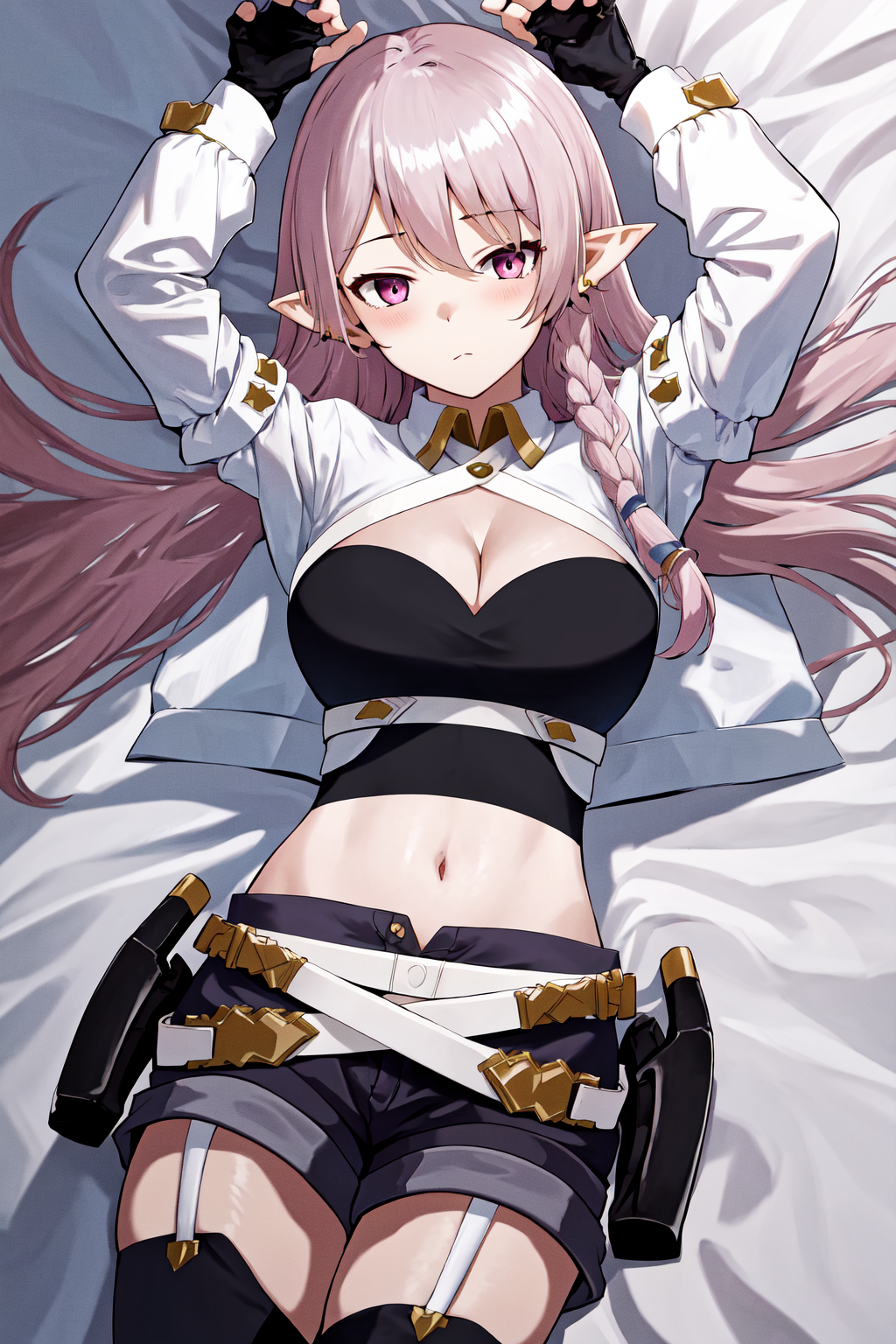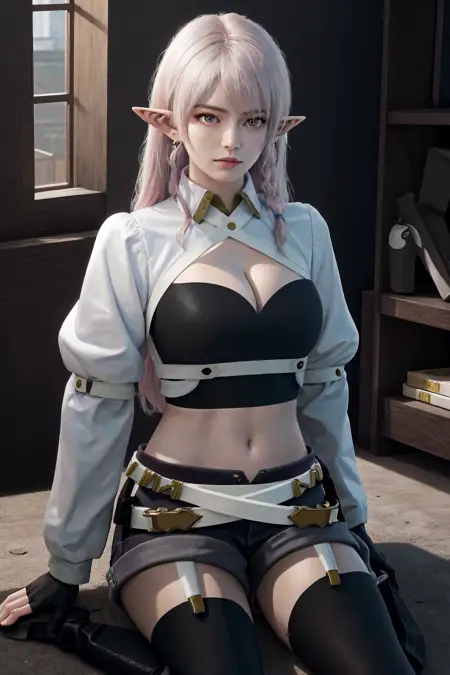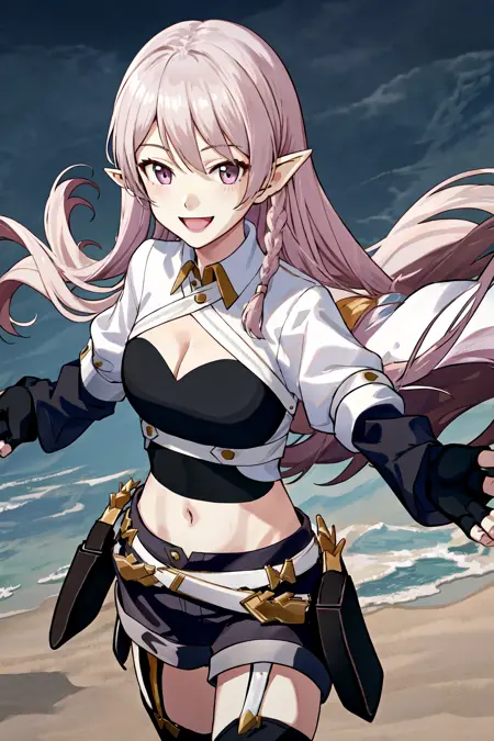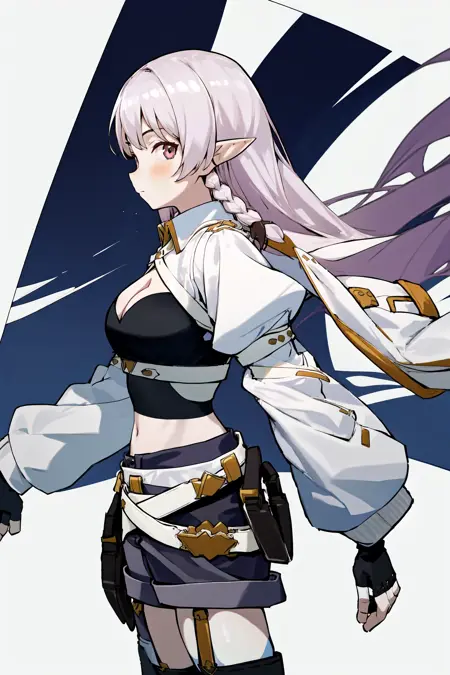 Default outfit: crop top cleavage cutout long sleeves white jacket black gloves fingerless gloves belt blue shorts black thighhighs white boots