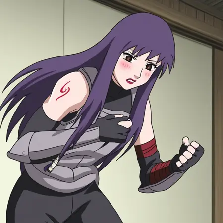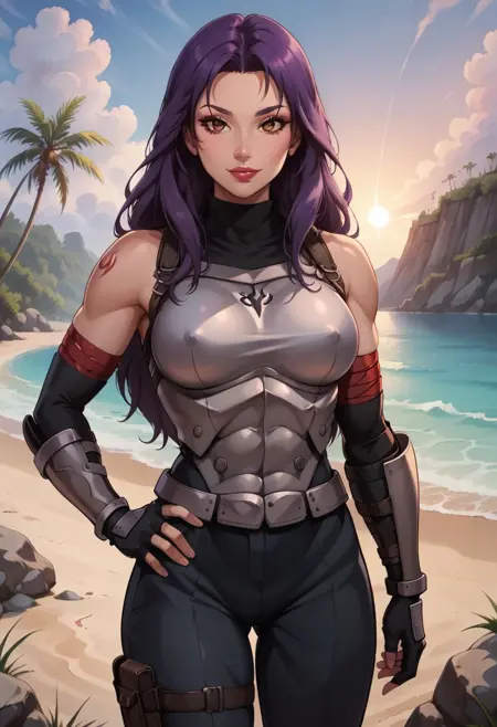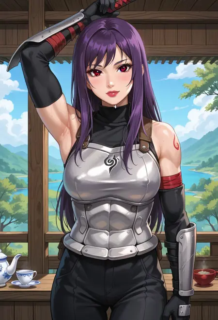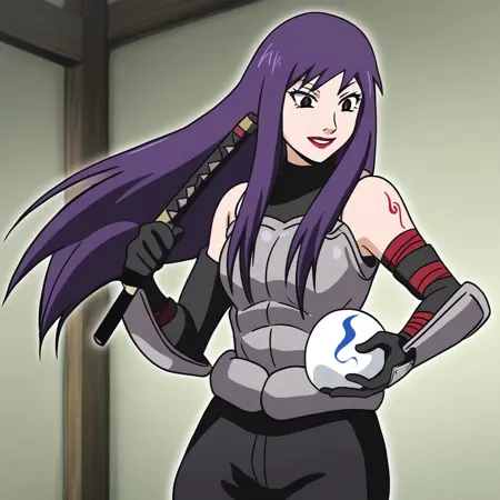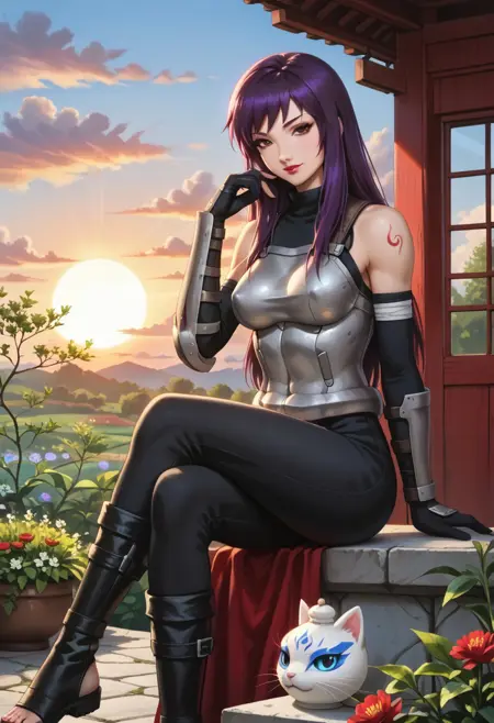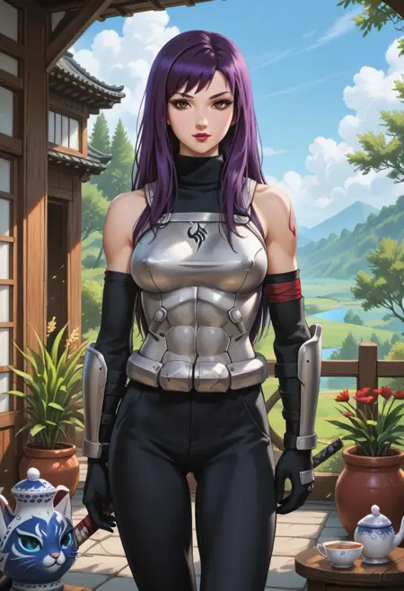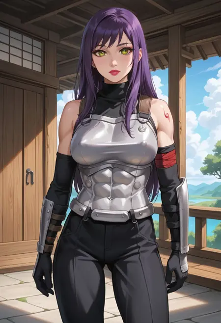 YugaoUzukiNS,1个女孩,单独,长发,直发,侧发,紫色头发,头发垂至腰部,棕色眼睛,嘴唇,口红,类似猫的瓷制面具,有三条红色条纹,大胸,裸露肩膀,黑色和灰色盔甲,金属臂甲,背后绑着武士刀,右肩有纹身,黑色肘部手套,黑色上衣,无袖,高领,黑色长裤,宽臀,露趾靴,绷带